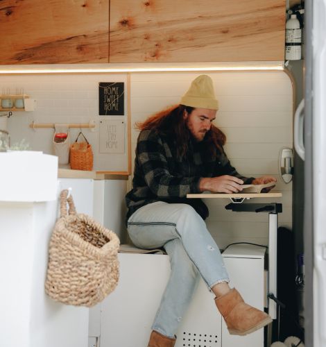 All upholstery is designed and hand-finished by Claire, our co-founder and lead upholsterer. With a background in furniture, textiles, and auto upholstery — plus years of vanlife experience — Claire knows how to blend comfort, durability, and style in a way that really works for life on the road.